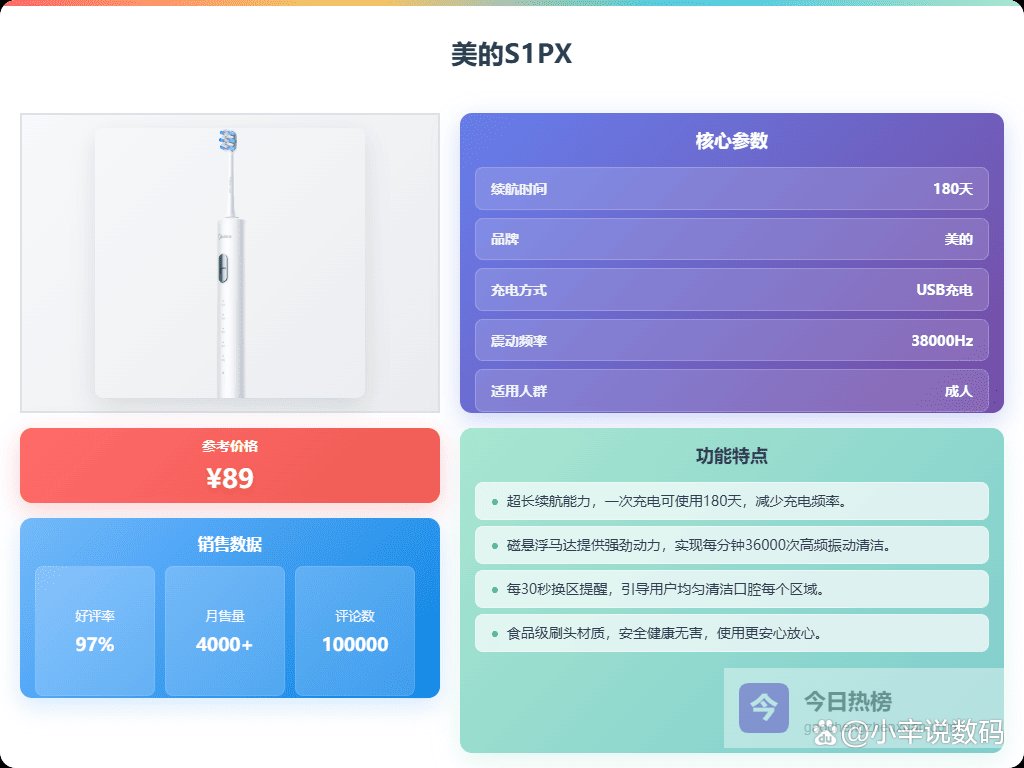 六、美的【高频声波振动】这款美的S1PX电动牙刷配备了每分钟高达36000次的声波振动,能轻松震碎牙菌斑,深入牙缝清洁得更干净。用起来感觉就像有个小动力帮你把牙齿洗得特别亮,效果还不错,而且震动时噪音控制在46-65dB之间,不会吵得影响生活。