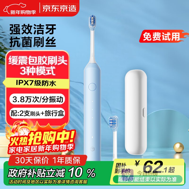 七、京东京造【高频声波清洁】这款京东京造Lite电动牙刷能每分钟震动38000次,用起来真的挺强的。高频声波帮你把牙齿表面和牙缝里的污垢、牙菌斑都能清得更干净,让你的口气更清新,也更健康。刷牙不用用太大力,轻轻一刷就能达到不错的清洁效果。
