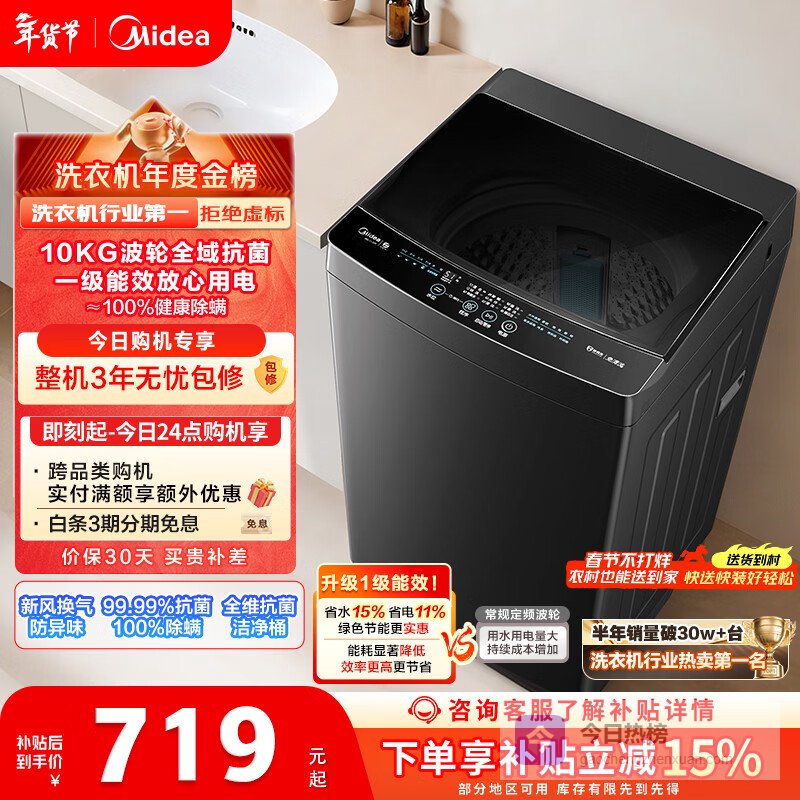 【京东自营】美的随心洗波轮洗衣机全自动家用10公斤专利免清洗健康除螨MB10V37T以旧换新国家补贴¥