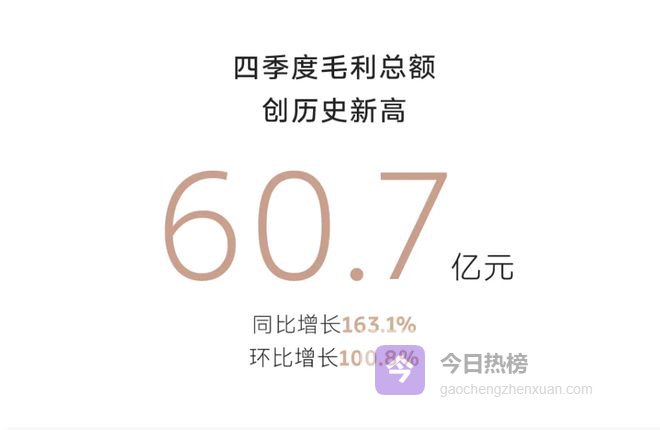 咱们可以看到,蔚来四季度毛利总额一共是 60.7 亿元,同比增长了 163.1% ,撇开销量的因素,就是卖车变得更赚钱了。
