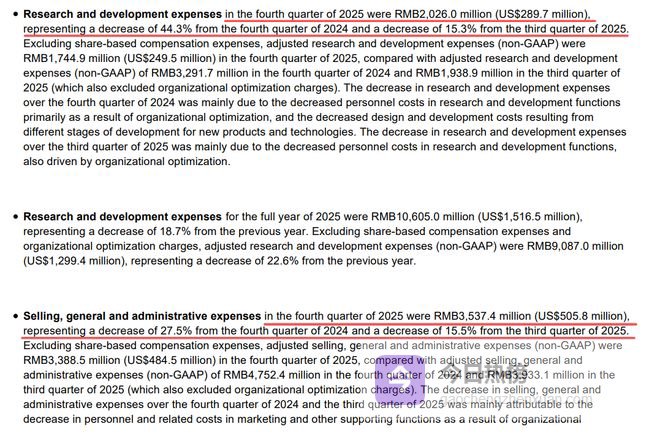 从业绩报告里可以看出来,蔚来在四季度对研发、销售费用都是大砍,比如研发从 2024 年 Q4 的 36.4 亿降到了 20.3 ,同比砍了 44.3% ;销售及管理费用从 48.8 亿降到了 35.4 亿,也砍了 27.5% 。它俩加起来就一共省了 30 亿左右,这可不是一个小数目啊。