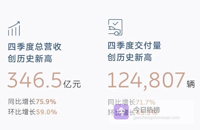 咱们看四季度蔚来的交付量,达到了 12.48 万台,同比上升 71.7% ,和营收的增速基本都对上了。具体大伙儿可以看下面这张图。
