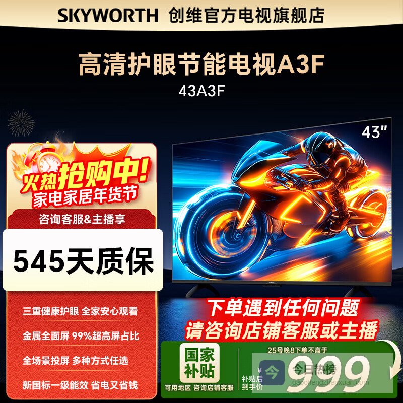 创维电视43吋 43A3F 43英寸金属全面屏 智能投屏 三重硬件护眼 液晶显示器 彩电平板电视机 一级能效 43英寸 43A3D升级款¥