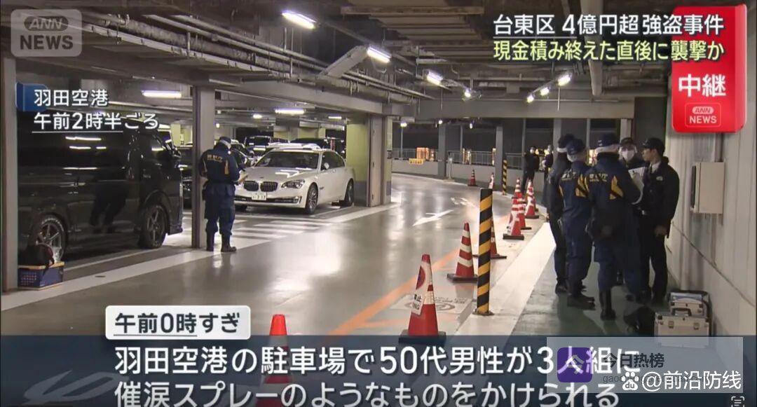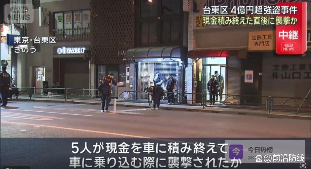 头一桩在上野那块地方。时间差不多是晚上九点半。一个四十来岁的中国男人在那儿。他还有几个日本同伴。两男三女吧。年纪都不太一样。他们正把箱子往车里搬。箱子看着挺沉的。路上没什么人注意他们。结果突然就来了三个人。那几个人拿着喷雾就喷。箱子里装的是钱。很多钱。四亿多日元就这么没了。