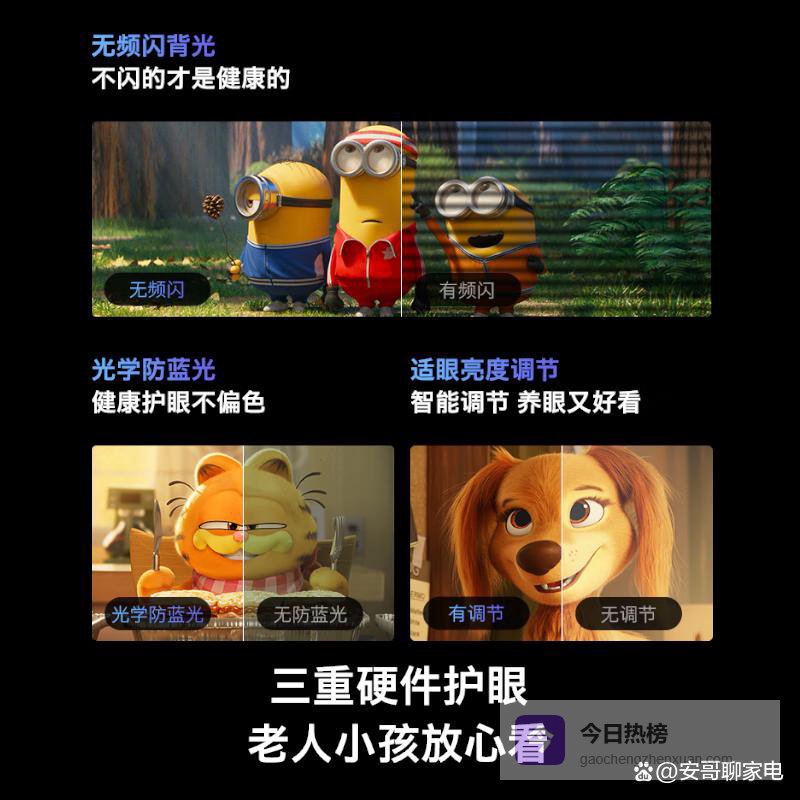 还有光学防蓝光技术,不是简单减蓝,而是精准过滤有害波段,保留有益蓝光,既保护视力又避免偏色发黄;再加上智能环境光感亮度调节,画面会自己“看天吃饭”,太亮自动降、太暗悄悄提,眼睛始终处在舒适区。卡通风、小黄人、狗狗视频,全家围坐一起看,清清楚楚又舒舒服服。