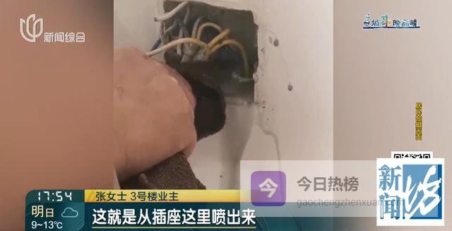 这是我们家的情况,当时说来排查来看看有没有水,现在水是哗啦啦地流出来的,肉眼都可以看见的,就是从插座这里喷出来,水都是乌黑乌黑的,每个房间都有水的,顺着墙往下流。