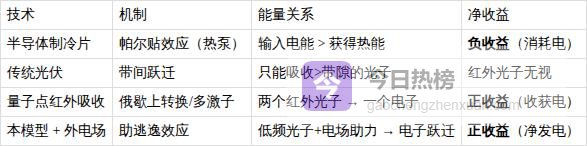 半导体制冷片的例子恰恰说明了这一点——它确实能吸收红外线(热端吸收热量),但那是“热泵”过程:热端散热量 = 输入的电功率+冷端制冷量 。也就是说,你投入一度电,换来的热量收益只有120%左右,是“入不敷出”的。这正是传统红外利用技术的困境。
