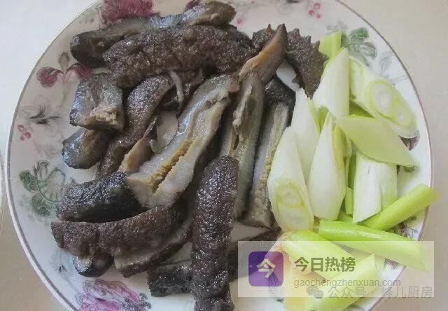 材料:海参、大葱、姜、五花肉、菠菜、鸡汤、生抽、蚝油、盐、花生油