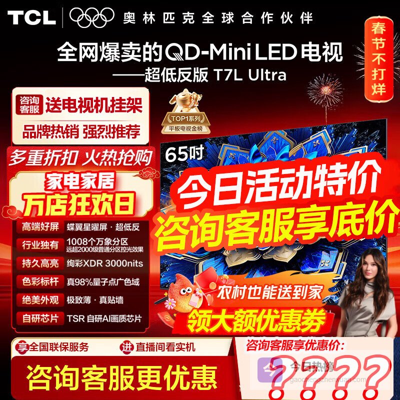 TCL电视 65T7L Ultra 65英寸 QD-Mini LED 蝶翼星曜屏 万象分区 绚彩XDR 3000nits超薄电视机国家补贴 65英寸¥