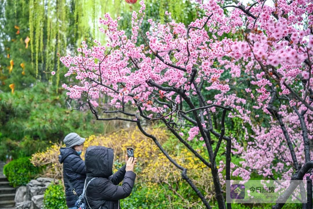 景区北门附近的美人梅则带着几分娇俏,粉艳的花瓣层层舒展,似少女颊边的胭脂,缀满小径,与翠绿的枝叶相映,艳而不妖。微风拂过,粉瓣轻扬,与喷涌的泉水相映成趣,每一处都藏着春日的柔情。