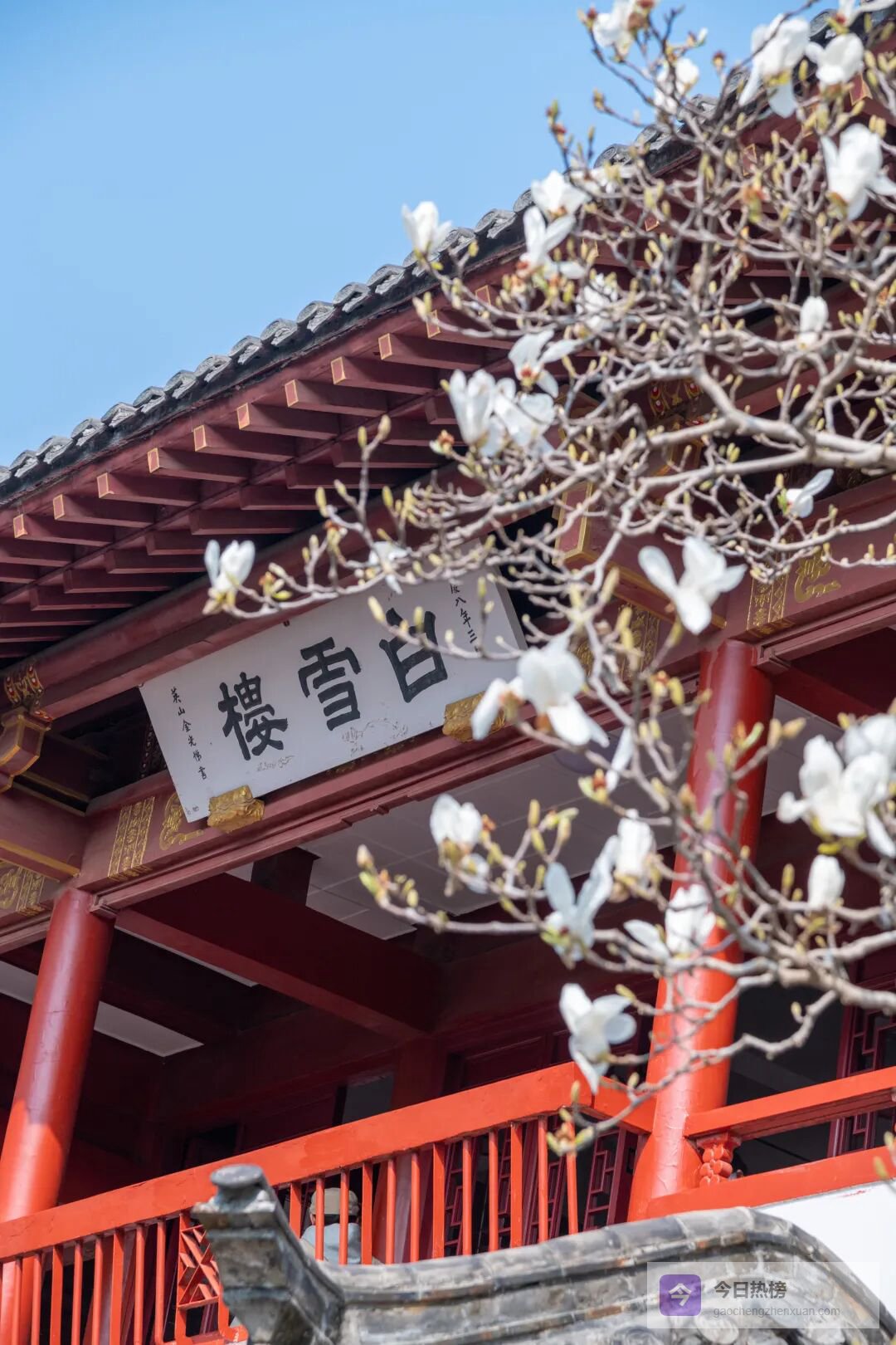 白雪楼前的玉兰花早已出圈,温润的白瓣似玉石雕琢,粉白的花瓣晕染着胭脂色,亭亭玉立在古建旁,花香伴着泉水叮咚,古韵与春意撞个满怀。