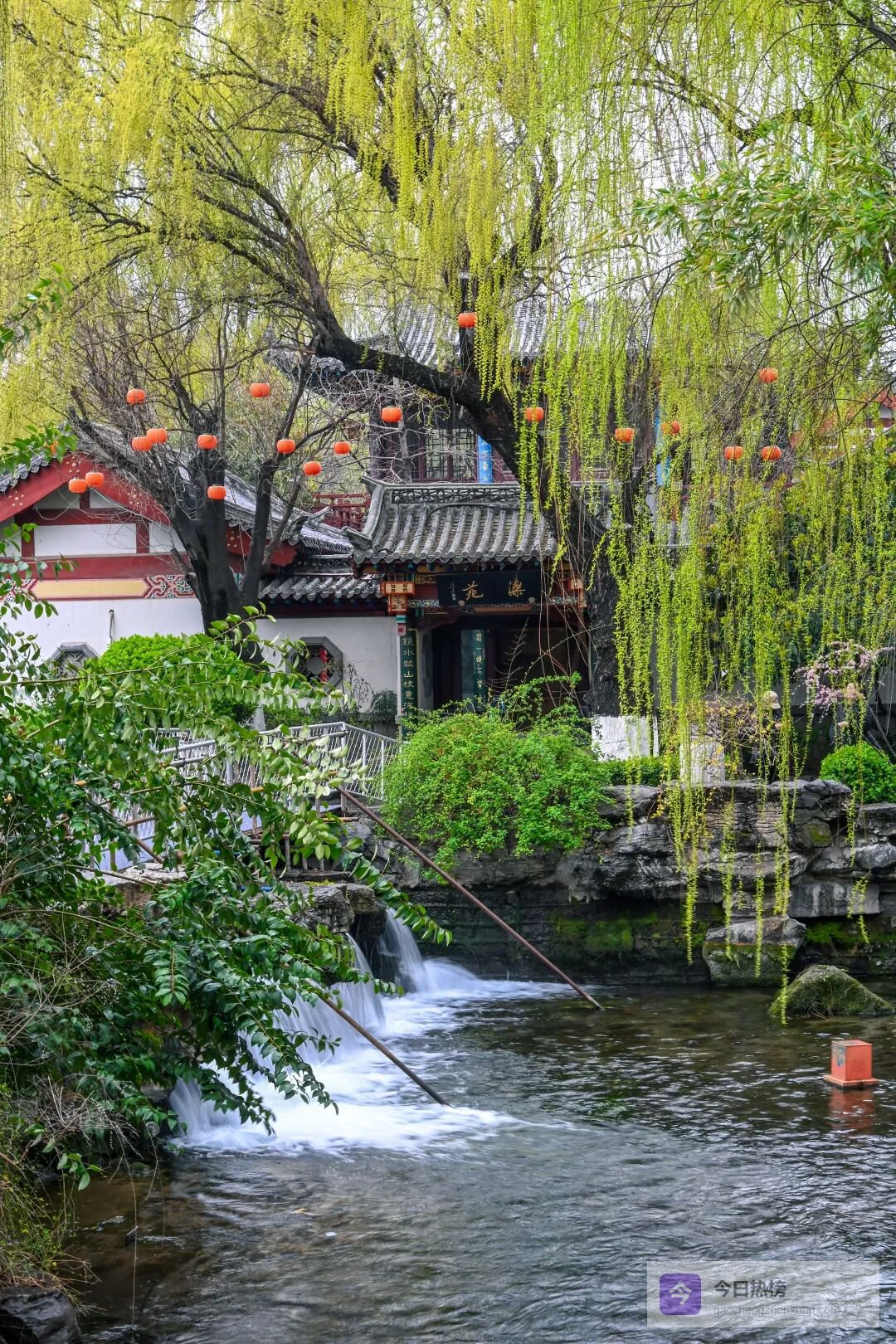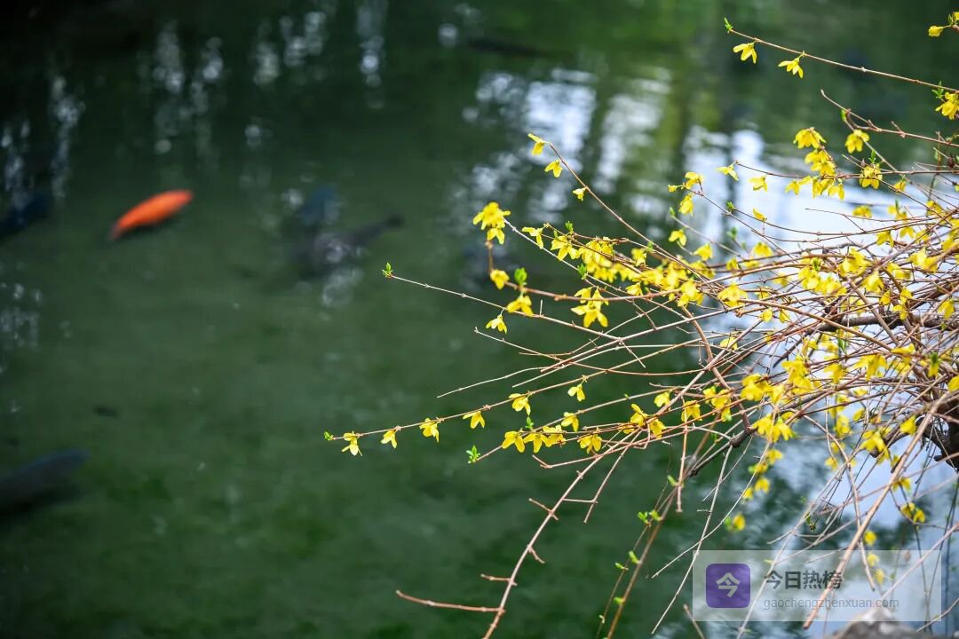 连翘已缀满泉畔的枝头,满枝金黄顺着枝条肆意舒展,像倾泻而下的金色流瀑,耀眼又鲜活,与青砖黛瓦、汩汩清泉相映,把古朴景致染成了春日的亮色。