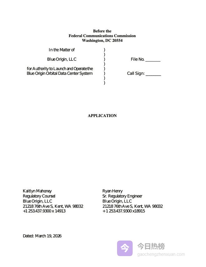2026 年 3 月 19 日,根据美国联邦通信委员会公开的申请材料,这家由 Jeff Bezos 创立的航天公司,计划推进一项名为“Project Sunrise(日出计划)”的太空数据中心星座项目,试图把部分 AI 和云计算能力搬到近地轨道。