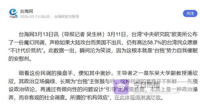 在岛内媒体追查下,发现这份民调的主要操盘手是东吴大学副教授潘欣欣,而这个名字在岛内并不陌生,其政治立场长期偏绿,多次公开为“台独”言论站台。所以,这份民调结果出现偏差也就不足为奇了。因为调查从一开始就带着明显的政治立场,岛内媒体甚至直言,这种“先有结论再找数据”的民调操作,在岛内政坛并不罕见,本质上不过是一种舆论工具,而非真正的社会调查。