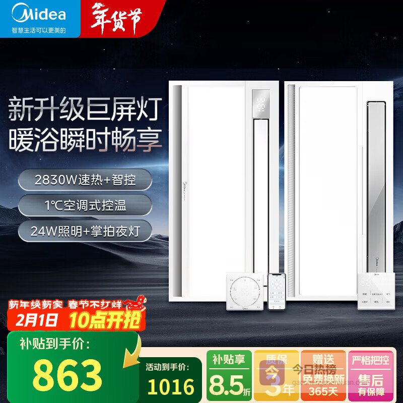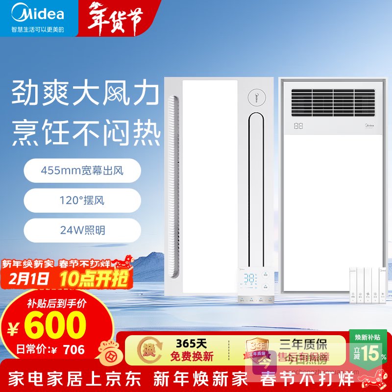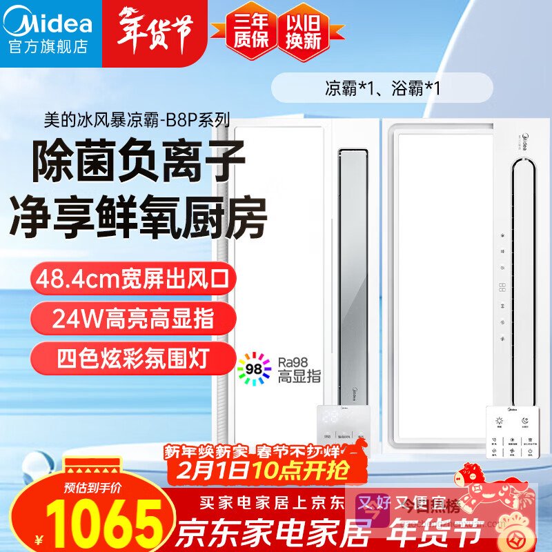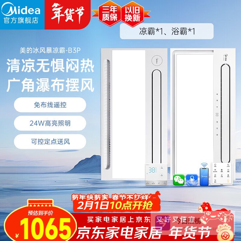 美的(Midea)厨房凉霸灯照明三合一体除菌冷霸吹风卫生间专用冷风扇机B3P 一卫一厨丨GP11+B3P智控套装¥