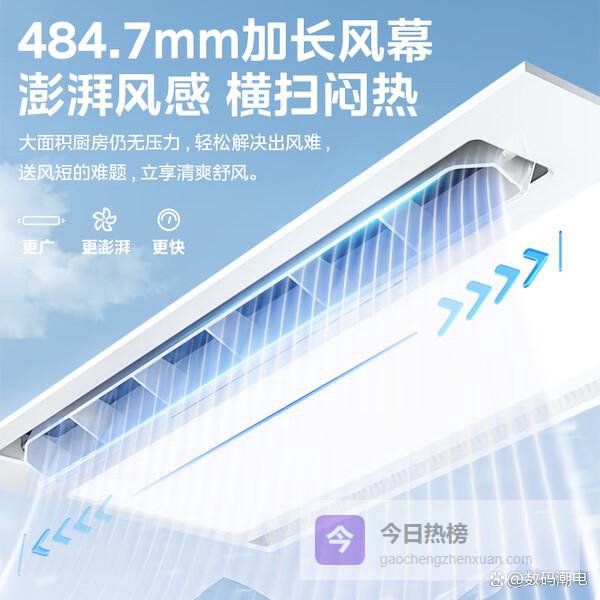 同时,484.7mm加长风幕的设计也挺实用。加宽的送风面积能快速带走厨房中的闷热和油烟,尤其在油烟大、出风困难的环境下表现还行。大面积风幕能更快地改善空气流通,让厨房空气更清新,也降低了闷热难耐的可能性。