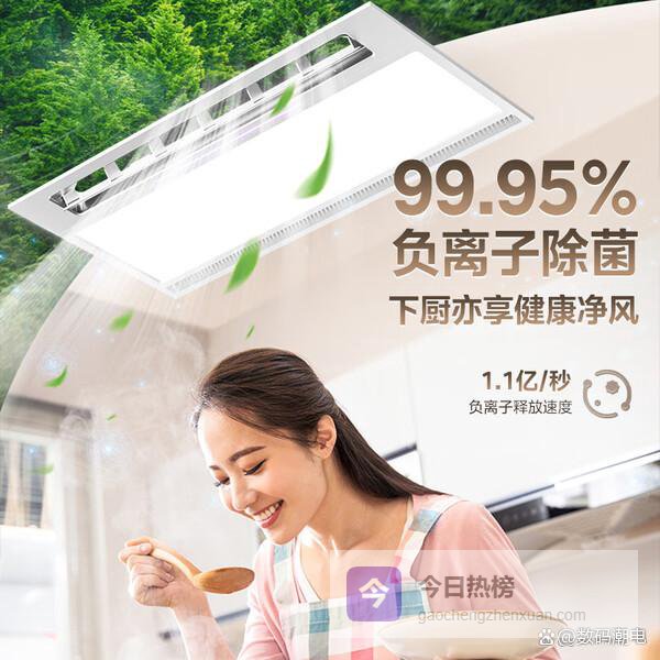 它还配备了除菌功能,通过高效的负离子技术,每秒释放上亿个负离子,能杀灭空气中的细菌和病毒,达到99.95%的除菌效果。这在烹饪时非常实用,有助于改善厨房的空气质量,减少油烟和细菌残留,特别适合注重健康生活的人士。除了空气净化,产品还集成了换气和照明功能,照明采用冷光(5000K以上),无频闪,不仅明亮还挺自然,对厨房的亮度和视觉舒适度都有提升。