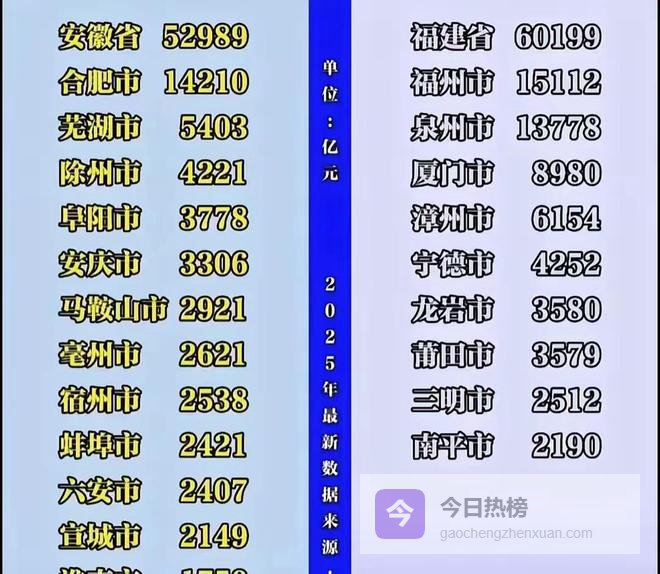 2025年福建GDP为60199亿元,位列全国第八,安徽GDP为52989亿元,位列第十一,从GDP规模、全国排名来看似乎差距不大。但从两省各自城市经济体量发展来看,差别还是挺大的。