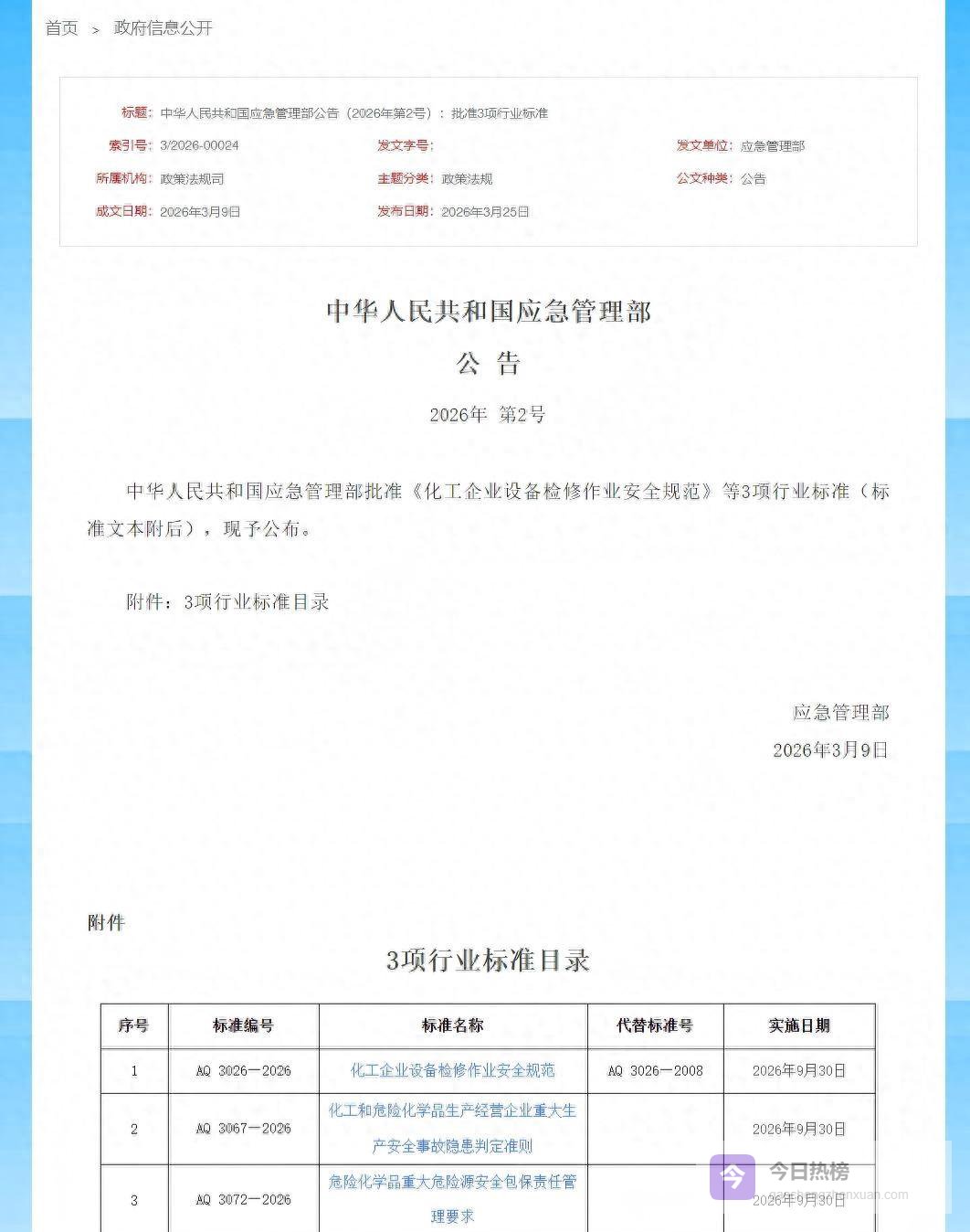 应急管理部公告(2026年第2号)一口气甩出3张“硬牌”——AQ 3026-2026、AQ 3067-2026、AQ 3072—2026,全部锁定化工安全,且全部在2026年9月30日正式生效。对企业而言,这是合规红线;对备考注册安全工程师的人来说,则是中级化工安全方向的核心命题库。