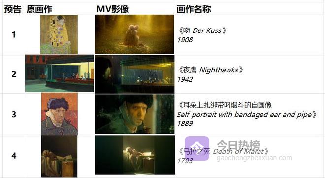 从 3 月 18 日至 23 日,连续6天,每天一支预告,只展示聚MV 中致敬的世界名画细节:第一支预告解锁克里姆特1908年的《吻》,第二支致敬霍珀1942年的《夜鹰》,第三支还原梵高1889年的《耳朵上扎绑带叼烟斗的自画像》,第四支重现大卫1793年的《马拉之死》,第五支复刻了米莱斯1851-1852年创作的《奥菲莉亚》,第六支则致敬了伦勃朗1632年的《尼古拉斯·杜尔博士的解剖学课》,全程不释放完整歌曲、不剧透核心剧情,只留下充满悬疑感的画面与艺术细节。