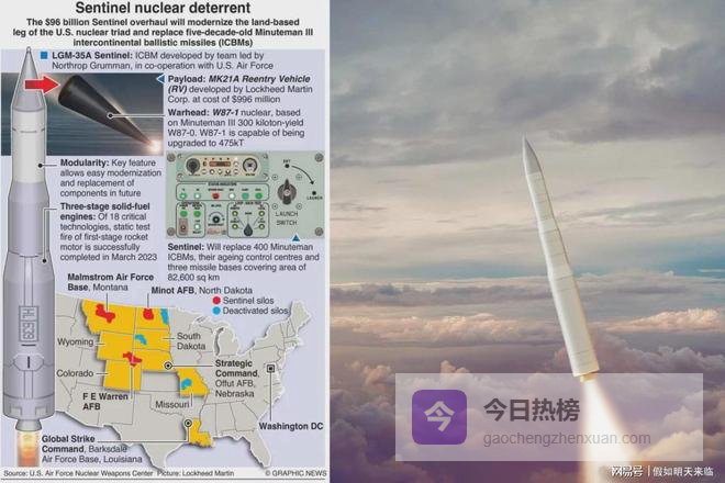 LGM-35A“哨兵”是美国下一代洲际弹道导弹系统,旨在取代“民兵-III”导弹,具备更优的射程、精度以及现代化的核威慑能力,可支撑长期战略行动。(《图形新闻》版权所有,未经许可不得转载)