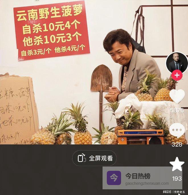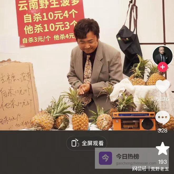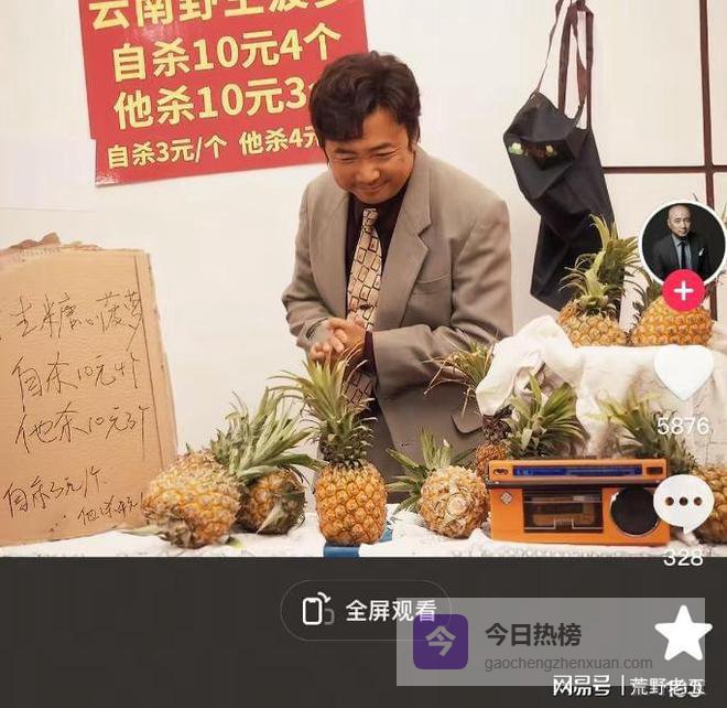 他戴着一顶假发走进了镜头里面,眼前的桌子上摆放了很多物品,有称重的称,还有很多菠萝。