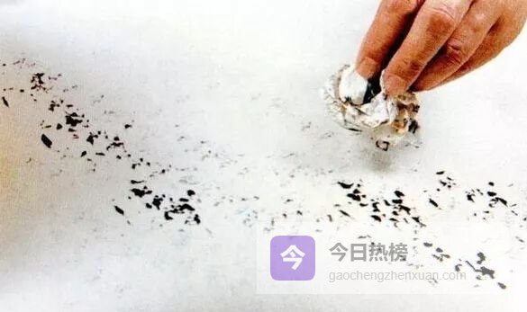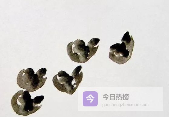 用干净笔蘸清水由外向内弹、点、洒,墨向两边渗开,中间留白,笔痕与水痕对比立刻出现;