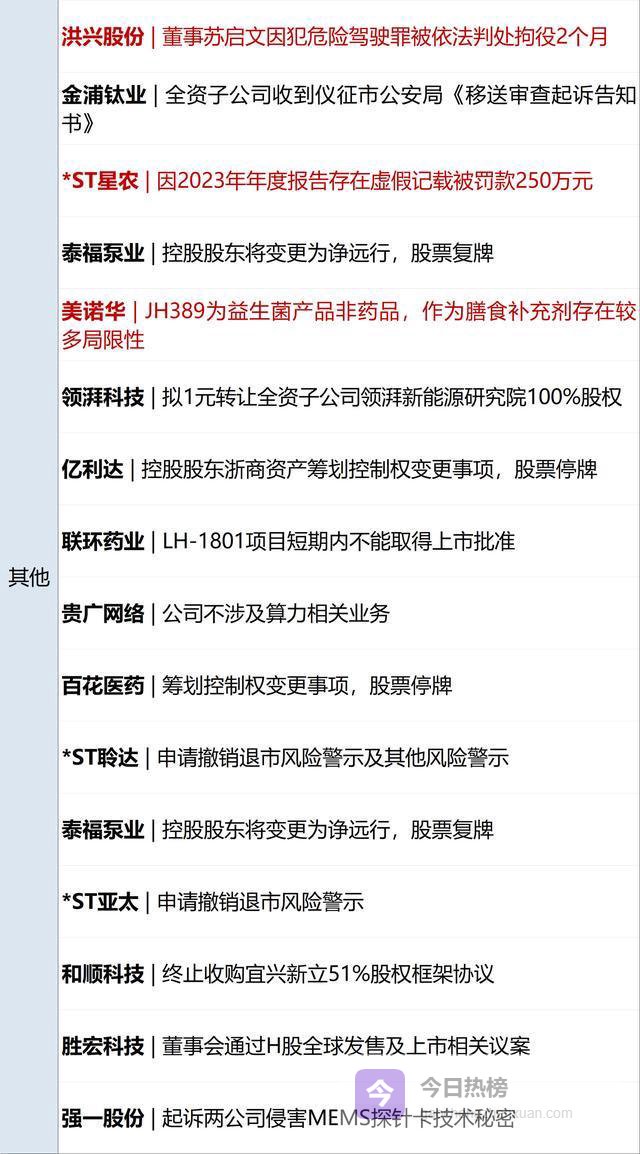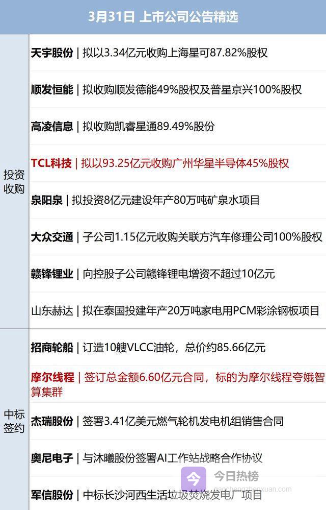 贵州茅台(SH600519,股价1420元,市值17782亿元):3月30日,贵州茅台公告称,自3月31日起,飞天53%vol 500ml贵州茅台酒(2026)销售合同价由1169元/瓶调整为1269元/瓶,自营体系零售价由1499元/瓶调整为1539元/瓶。贵州茅台同日公告称,公司第四届董事会2026年度第四次会议决定,免去蒋焰副总经理、财务总监、董事会秘书职务。