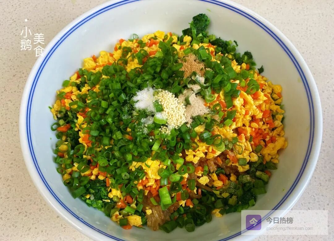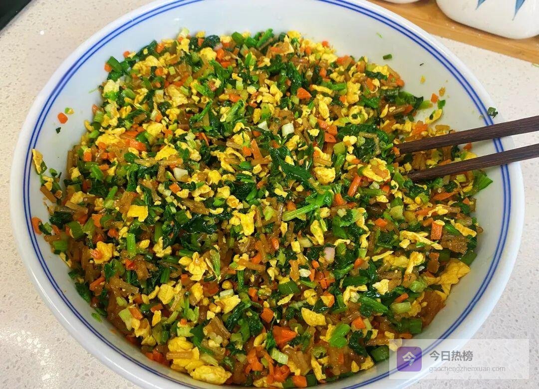 拌馅——把放凉的鸡蛋、胡萝卜、粉条全部倒进大盆,加半碗葱花、盐、花椒粉、胡椒粉、鸡精调味;充分搅拌均匀后香味瞬间溢出。