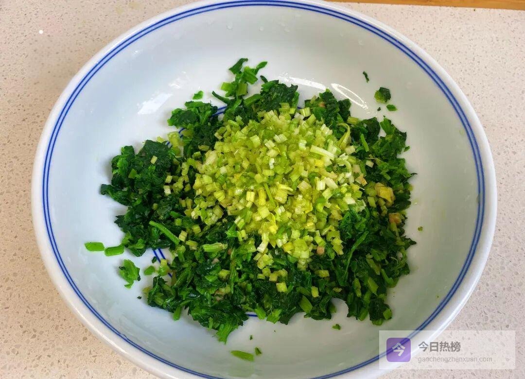 切碎锁水——攥干水分后切碎;再切半颗香芹提味增香;一起淋一勺熟油拌匀锁水。