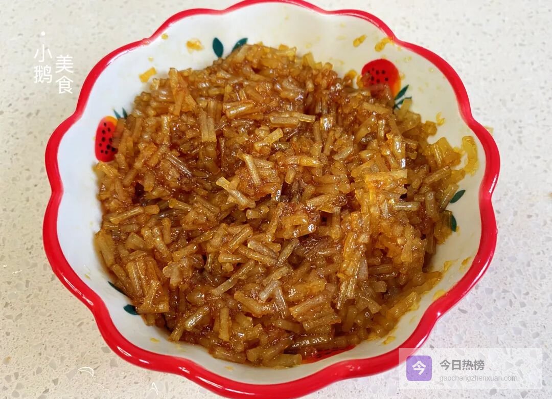 泡粉条——半碗粉条碎用开水泡软,沥干水分加适量老抽上色提味,再淋少许香油防粘,拌匀备用。