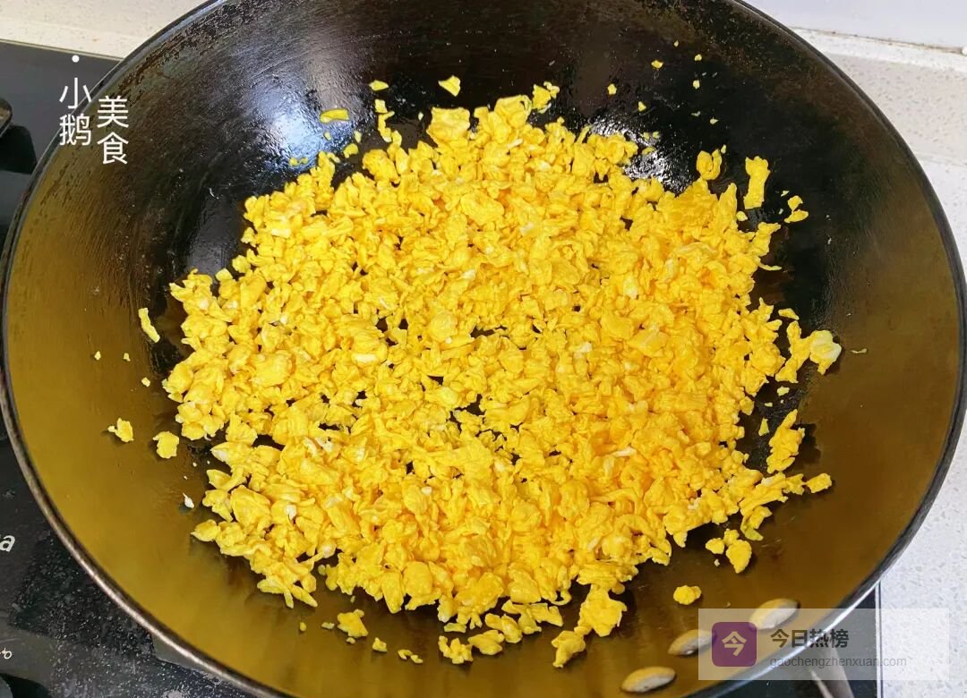 炒鸡蛋——5个鸡蛋充分搅散;热锅凉油倒入蛋液,用筷子快速搅散成鸡蛋碎。