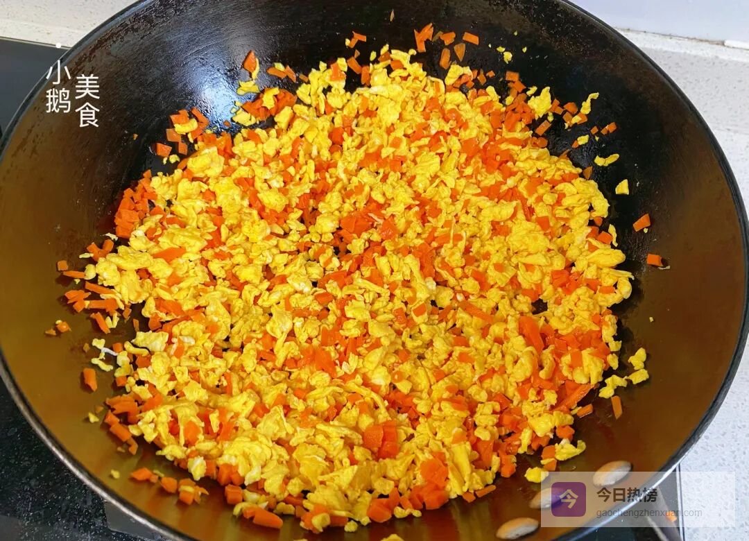 炒胡萝卜——胡萝卜碎下锅炒至变软断生;胡萝卜含脂溶性维生素,用油炒过之后营养更容易吸收。