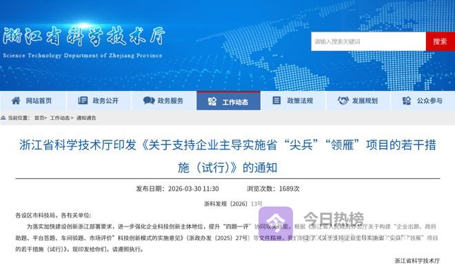 为落实加快建设创新浙江部署要求,进一步强化企业科技创新主体地位,提升“四题一评”协同攻关效能,根据《浙江省人民政府办公厅关于构建“企业出题、政府助题、平台答题、车间验题、市场评价”科技创新模式的实施意见》(浙政办发〔2025〕27号)等文件精神,我们制定了《关于支持企业主导实施省“尖兵”“领雁”项目的若干措施(试行)》,现印发给你们,请遵照执行。