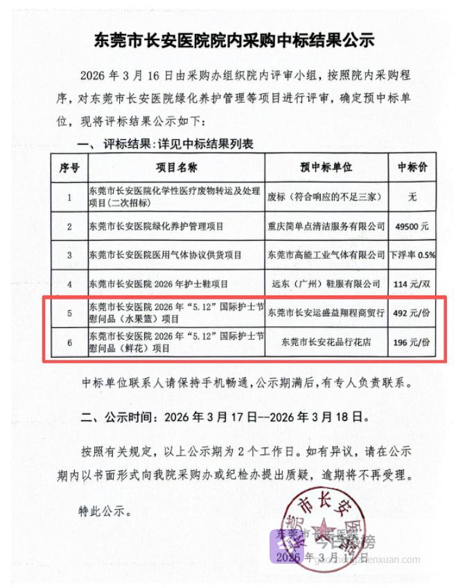 公示称,3月16日经由采购办组织院内评审小组,对东莞市长安医院相关项目进行评审,确定预中标单位。表格列有6个项目,其中第5项为东莞市长安医院2026年“5.12”国际护士节慰问品(水果篮)项目,中标价格为492元/份,预中标单位为东莞市长安运盛益翔程商贸行,第6项为2026年“5.12”国际护士节慰问品鲜花项目中标价为196元/份,中标方为东莞市长安花品行花店。公示期为3月17日至3月18日。