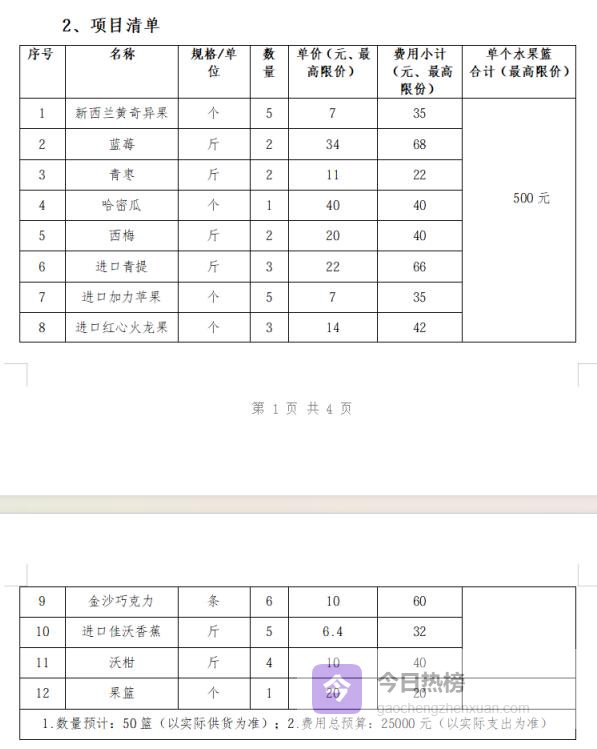 院方提到,经医院班子会议研究决定,今年护士节期间,为50个业务科室各配鲜花1束,水果篮1份,其每份水果篮含新西兰黄奇异果5个、蓝莓2斤、青枣2斤、哈密瓜1个、西梅2斤、进口青提3斤、进口加力苹果5个、进口红心火龙果3个、金沙巧克力6条、进口佳沃香蕉5斤、沃柑4斤及篮子一个,总计11种水果及食品,重20多斤,费用从医院护理部预算经费支出。其中,确定采购最高限价为水果篮500元/份、鲜花200元/份,总预算不超过3.5万元。