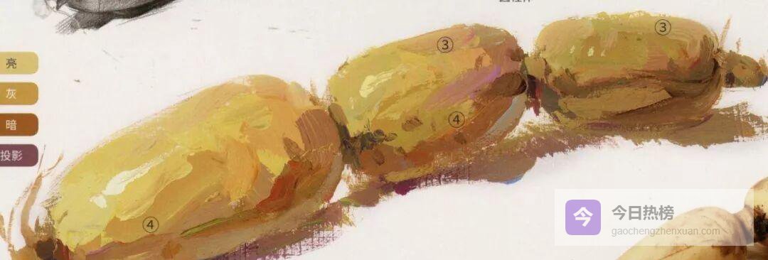 4.3 ▣ 第二遍过渡——灰面出现层次用淡黄+珍珠白+淡紫层层推进,灰面纯度比亮面低两度,笔触方向顺着藕节弧度走,让体积自己“鼓”出来。