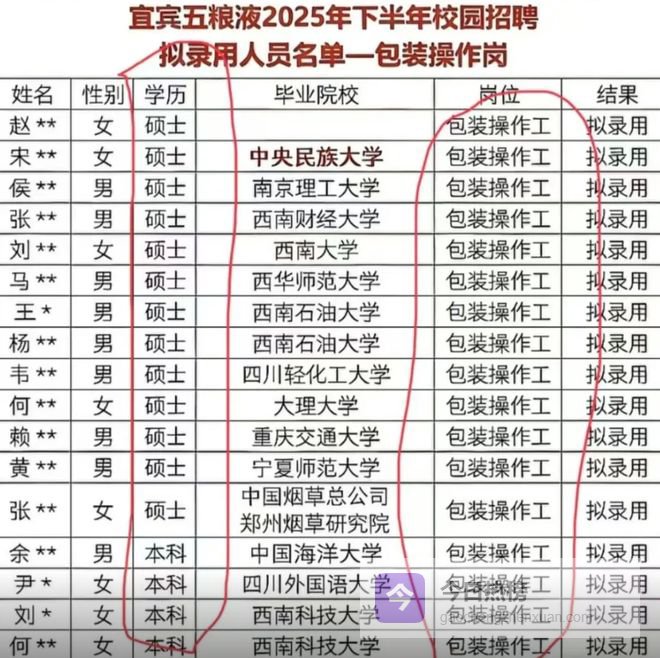 2026年4月初,宜宾五粮液2025年下半年校园招聘的拟录用名单被曝光出来,而其中一页“包装操作工”岗位的录用详情,着实让人惊讶,基本都是硕士应聘这个岗位,这不妥妥的就是大家口中的学历贬值了。究竟是不是这样呢?
