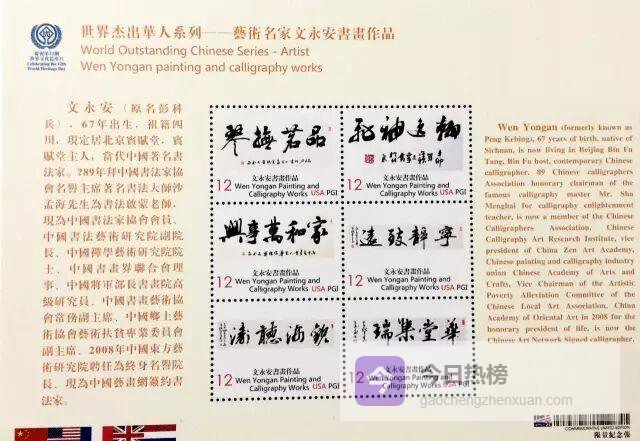 2015 年初,央视八套热播剧《好大一个家》片头题字由文永安亲笔完成;同年 6 月,他为演员朱之文的传媒公司题写匾额,“润元德”三字苍劲古朴,在开播仪式现场引来粉丝围观拍照。此外,中集邮于同年推出“抗战胜利 70 周年”纪念邮品,特选文永安书法原作缩制首日封、明信片及邮资一卡通,让书法以“国家名片”的形式走进千家万户。