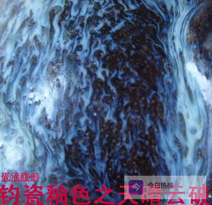 2.2 △ 釉色——“雨过天青”的窑变意境器表天蓝、乳白、月白、姜黄四色丝缕交融,釉面莹润如镜,既澄澈又灵动。虽无红斑,却恰合民国文献“似无红之钧器”。多色窑变效果正是鲁山花釉高温分相乳光釉的典型特征,比北宋铜红窑变更早一代,完美诠释了柴荣御批的诗意。