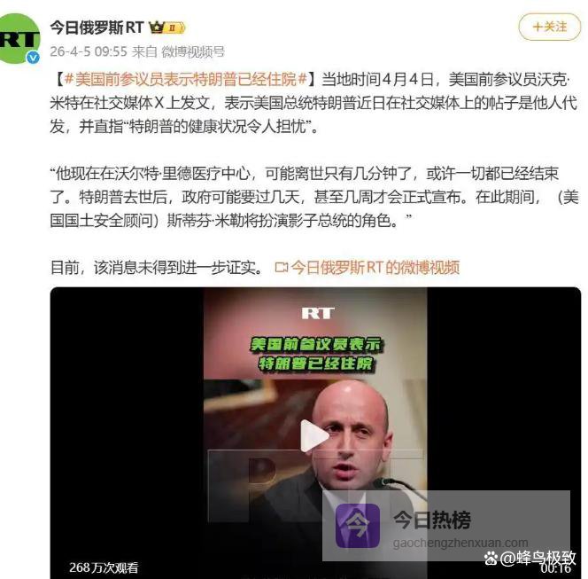 他言之凿凿地宣称,80岁的特朗普大概率正在沃尔特·里德医疗中心抢救病危。