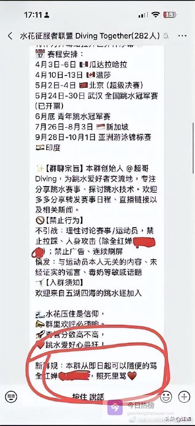 而整个事件的导火索,是一个名为“水花征服者联盟”的微信群。这个创立于2022年、拥有282名成员的群组,其荒诞和恶毒程度,超出了许多人的想象。而且它的群规很是奇葩:“禁止人身攻击(全红婵除外),可以随便辱骂全红婵,照死里骂”。