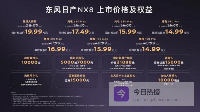 在产品矩阵与定价上,NX8同样展现出务实的智慧与突破的锐气。其提供了纯电与增程双动力、共六个常规版本,价格从15.99万元覆盖至18.49万元,精准锚定了主流家庭购车预算的核心区间。而叠加“超级置换礼”后,14.99万元的起售价,无疑构成了强烈的市场冲击,是给予消费者的“意外之喜”。此外,NX8还以19.99万元的价格推出了搭载800V超充、专属设计的“品牌大师版”,在提升品牌调性的同时,也为追求极致体验的用户提供了选项。这种“主流走量 高端立标”的矩阵式布局,既保证了市场基盘的宽度,也预留了品牌向上的通道。尤为重要的是,其纯电车型上市即交付,增程车型迅速跟进的节奏,显示出东风日产在供应链与生产准备上的成熟度,避免了“发布即期货”的行业通病。