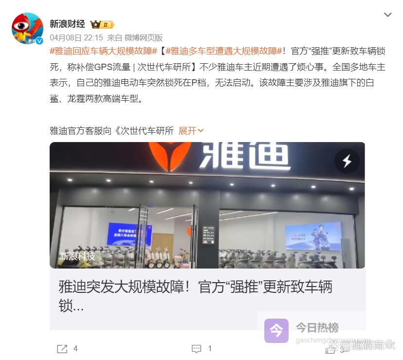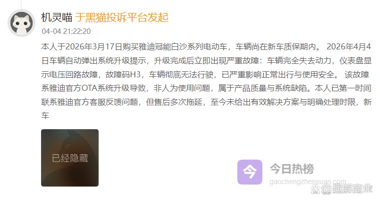 黑猫投诉平台上,4月4日,一位雅迪用户投诉称,其于2026年3月17日购买雅迪冠能白鲨系列电动车,车辆尚在新车保质期内。2026年4月4日车辆自动弹出系统升级提示,升级完成后立即出现严重故障:车辆完全失去动力,仪表盘显示电压回路故障,车辆彻底无法行驶,已严重影响正常出行与使用安全。