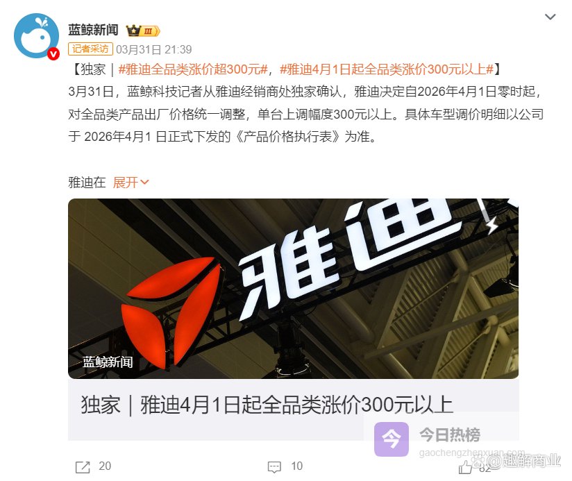 虽然整体业绩回升,但雅迪仍在涨价。近日,有雅迪经销商透露,雅迪决定自2026年4月1日零时起,对全品类产品出厂价格统一调整,单台上调幅度300元以上。具体车型调价明细以公司于 2026年4月1 日正式下发的《产品价格执行表》为准。