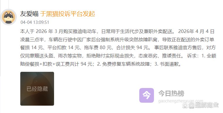 同日,另一位用户表示,其于 2026 年 3 月购买雅迪电动车,日常用于生活代步及兼职外卖配送。2026年 4 月 4 日凌晨三点半,车辆在行驶中因厂家后台强制系统升级突然故障趴窝,导致正在配送的外卖订单餐损 14 元、平台扣款 14 元、拖车费 80 元,合计损失 94 元。 事后联系雅迪官方售后,对方仅同意赠送头盔、雨衣等实物,拒绝赔付实际现金损失,态度恶劣、推诿责任。