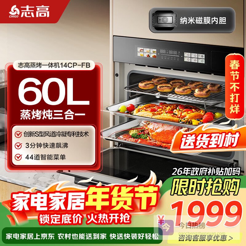 【京东自营】志高【政府补贴15%】蒸烤箱一体机嵌入式微蒸烤60L大容量纳米搪瓷自清洁蒸箱烤箱蒸烤炖三¥