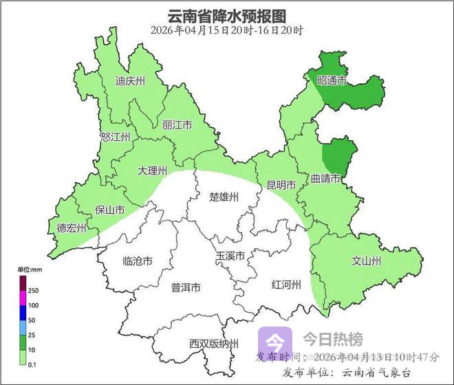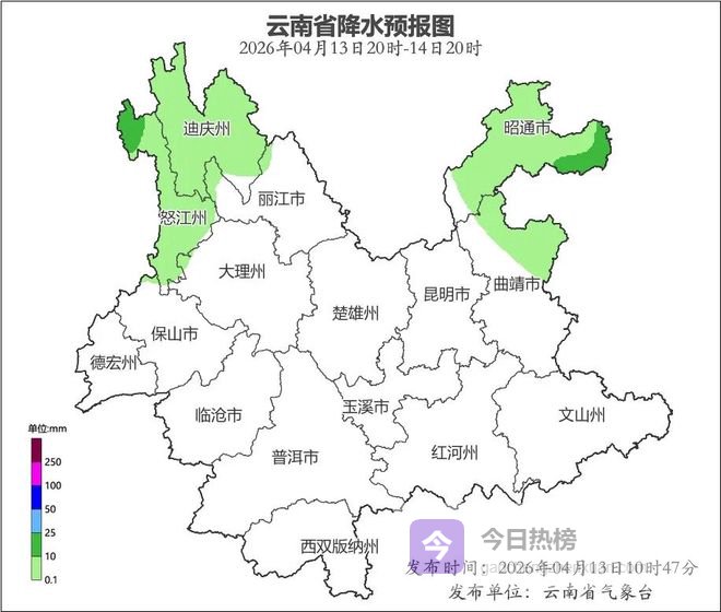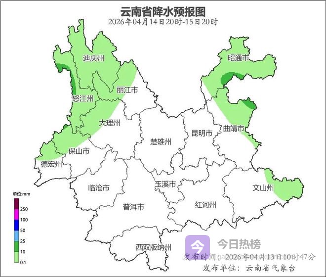 4月13日20时到4月14日20时:昭通市、曲靖市东北部、迪庆州、怒江州多云有阵雨局部中雨,其他地区晴间多云。