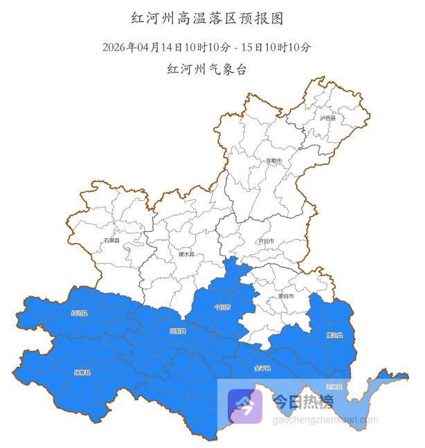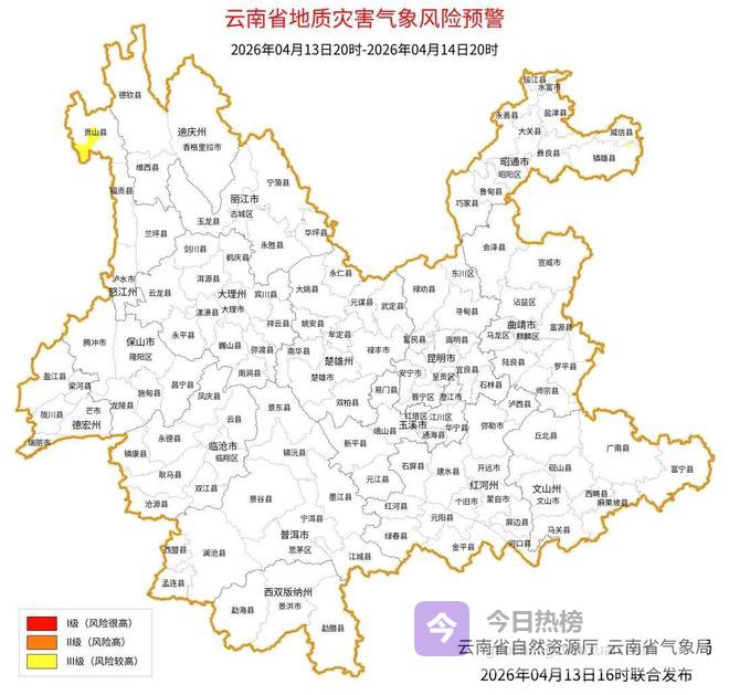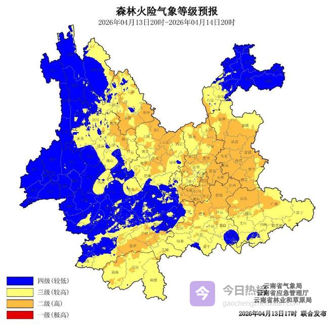 预计4月13日20时至4月14日20时,丽江市东南部、大理州东北部、楚雄州中部和北部、昆明市中部和东部、玉溪市东部、红河州中北部、文山州西北部、曲靖市大部、普洱市中南部二级(高),迪庆州东部、丽江市中北部、大理州中西部、临沧市东北部、普洱市南部和北部、西双版纳州、楚雄州东部和西部、昆明市西部、昭通市南部、玉溪市北部、红河州中南部、文山州东部和南部、曲靖市北部三级(较高),其他地区四级(较低)。