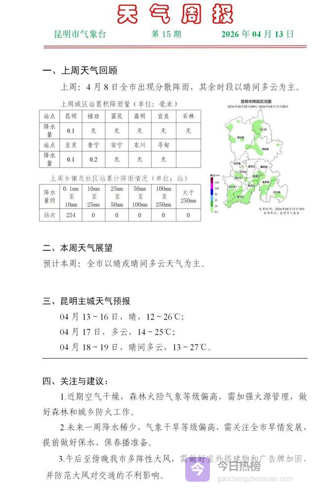 本周需重点关注云南中部较高的森林草原火险;西北部和东北部需注意防范局部地质灾害;东部和北部局地有雷暴、短时强降水等天气,需防范强对流天气对交通运输、户外作业的不利影响;河谷地区有35℃以上高温天气,需做好高温中暑、安全生产、农业生产等高温灾害风险防范应对工作,以及防溺水工作。